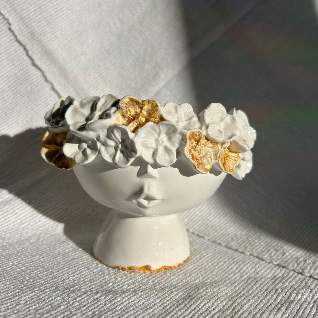 It is not only a place for flowers, but a presence of its own — sculptural, serene, and quietly expressive. The textured rim moves like petals in motion, while the subtle golden accents reveal beauty in imperfection.